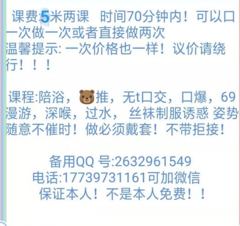 先说价格600两次,一次也是这个价,在杭州算是性价比的存在了,联系好过去,本人和照片不算出像了,先脱衣服洗澡,然后ab面,口,课表上有的都有,服务算是比较细了,第一次结束中间可以休息一会,给你捏捏,不催人不机车,态度还是挺好的,值得冲兄弟们,这两天休息了,加她的稍等两天