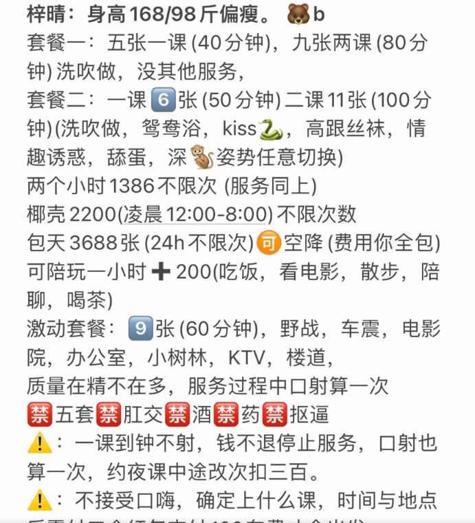 小姐姐工作室在地铁口出来。很好找,地铁探花很方便。属于小鸟依人型身高160这样,开门见面就穿个黑丝高跟包臀裙。很性感直接就硬了。然后就开始正常流程,说说重点,丝袜情趣我做了两次换了两身。她说我有喜欢的也可以买来她穿。两次收我9张。口活不错。胸有C杯,配合度高。换了很多姿势。但是可能小姐姐爱干净没有给我69。别的都很配合。总结就是出击方便,小姐姐对版好看,而且人好说。有的时候还给我一包白龙怕我没烟抽。(还有小姐姐的微信似乎添加过多被封了,有条件的所有,去TG的频道联系小姐姐)
