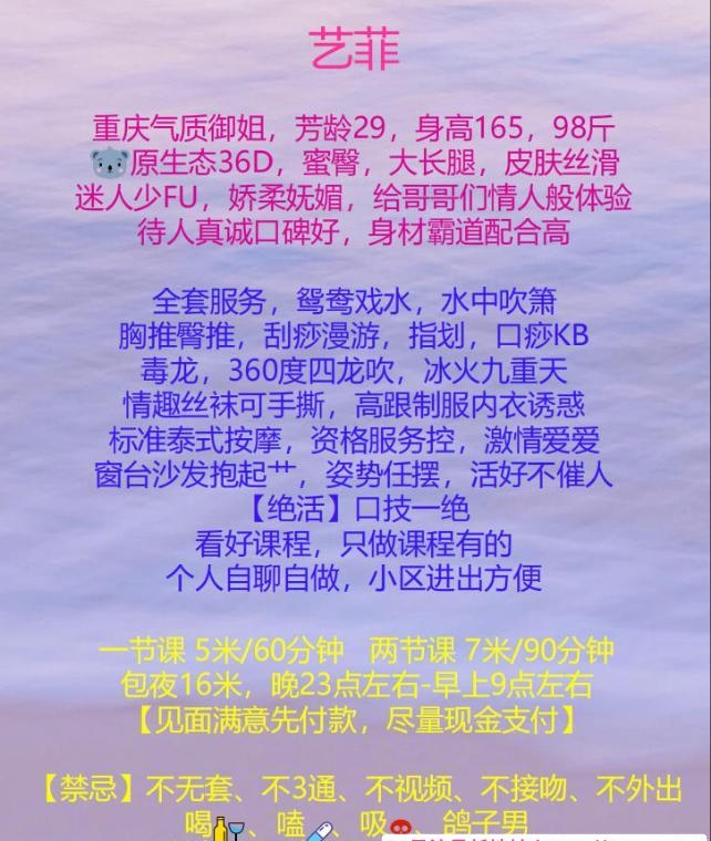 服务项目: 全套服务鸳鸯戏水水中吹箫臀推胸推刮痧漫游指滑口痧口暴毒龙冰火九重天泰式按摩爱爱