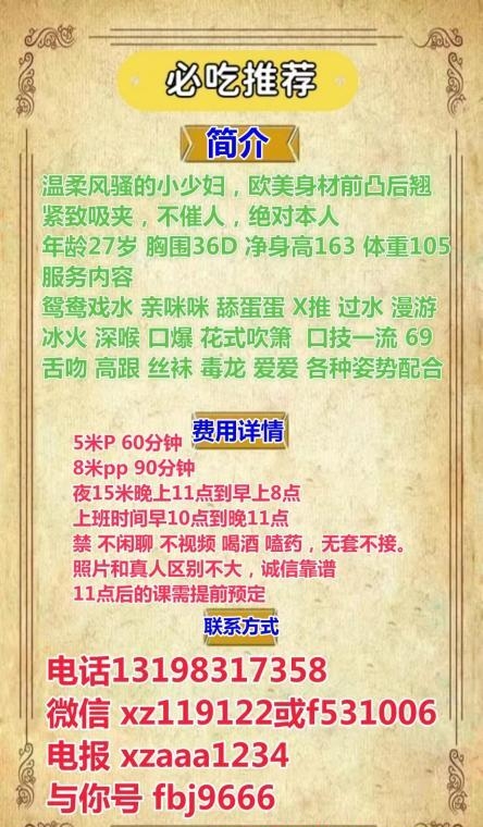 服务项目: 鸳鸯浴 毒龙 69 胸推 臀推 爱爱