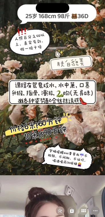 这个妹子胸真的大而且也不胖 ,身材巨好,纯天然D罩杯,两只手握不住,很软,而且也很粉,会的不多刚到成都,待不了几天说,追求极致服务的就算了,但是冲这个胸哪怕没服务还能舌吻就可以直接冲了,也不催,服务说的都做,叫声很淫荡,有丝袜选,绝对不亏