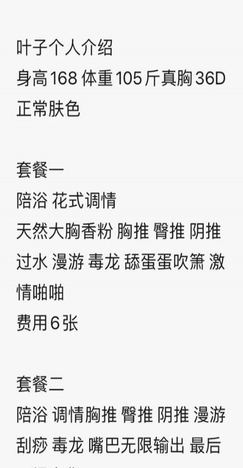 优点:服务系,喜欢服务的可以体验,服务过程很认真,每一项服务都有,过水、漫游、吸皮很舒服,胸推,臀推,阴推应有尽有,毒龙很顶,吸蛋蛋也很认真,口时间也长,相对于其他服务写一堆过去敷衍了事的老师来说,这个真的是主打服务,态度也很好。 缺点:不能跟嫩妹比嫩,颜值一般。