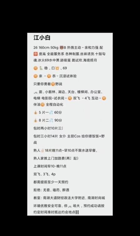 刚来武汉发掘,与妹子见面,发现很漂亮,很真实。去的时候妹子有很多装扮服装。问我喜欢可爱的,还是御姐的,当然御姐,黑丝高跟鞋。很骚,主动。喜欢的去挑战,总体服务很好。很满意会常来,有姐妹,熟悉了可以一起。姐妹都属于各有千秋。有想体验速度冲,很火的一个妹子,约要提前预约,好安排时间