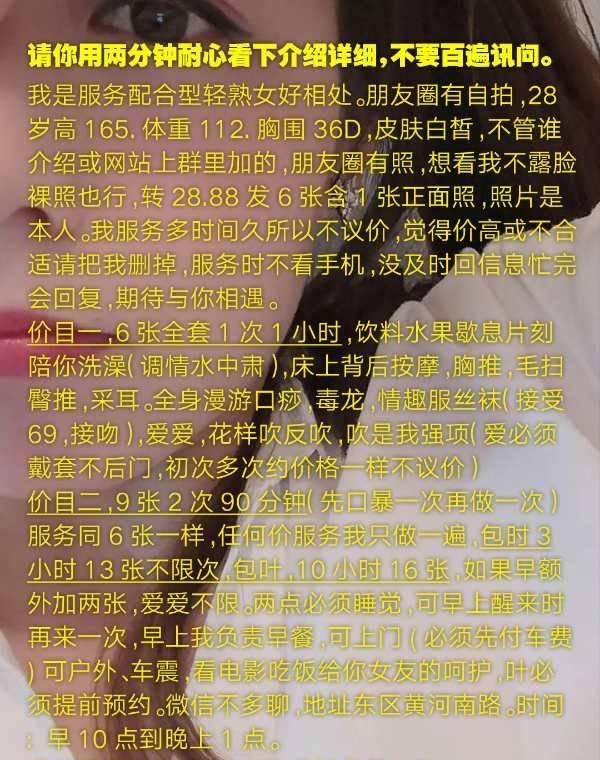 服务真的没得说,小姐姐一年有几个月在郑州,主打服务,而且张的也好看,遥控上楼,已经穿好情趣内衣等着了,直接看的流口水,让后去帮你洗澡,洗的是时候还口,当场就想交枪了,多的不说了自己体会,钱花的绝对值