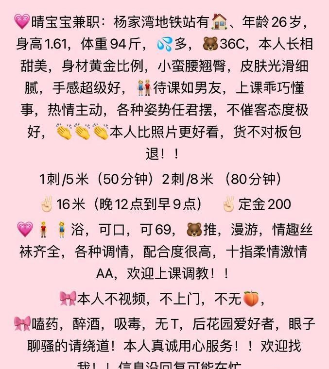 帖子上看到加了很久了,刚好赶到十一有空就微信联系上了,在地铁站旁位置也比较好找,进门后姐姐非常热情笑得好甜美.随后进房间以后姐姐衣服一脱凹凸有致.粉嫩粉嫩乳房看的我激动的澡都不想洗了.我直接按着姐姐上下其手,非常棒的一次体验感,具体细节我觉得还是得亲自来感受。必须推荐。