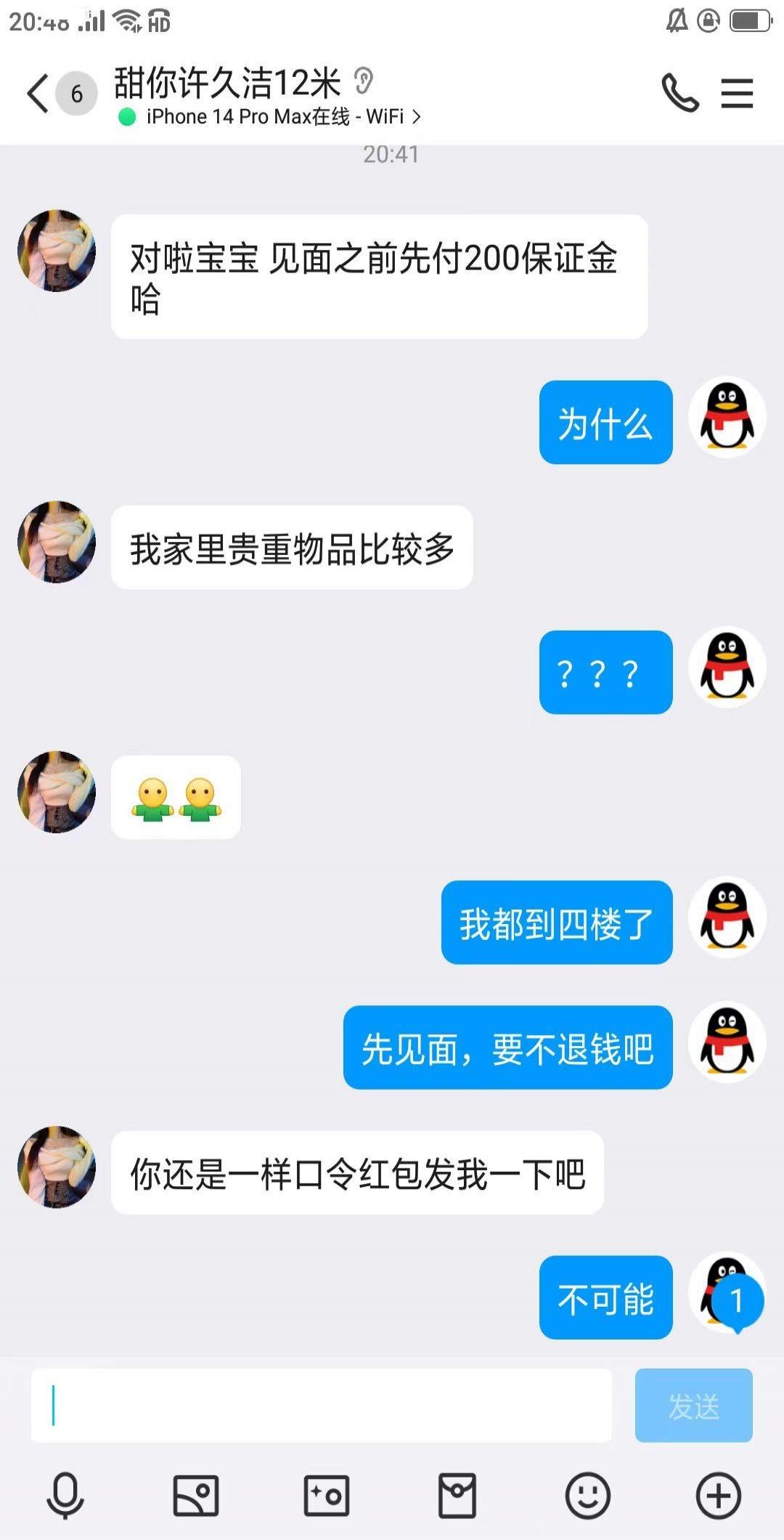 整个一骗子,先说100定金,到了楼下,又说家里有贵重东西,需要再交200才能开门。这时候基本确定是骗子了,我说你要证明下你在屋里,你敲下门,或者位置共享,或者发之前别人的付款截图,都没有!!大骗子,大家避雷,别再上当了。