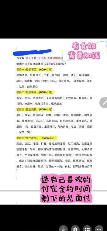 之前去过的很靠谱,有奴女,身高163,体重105,年龄33,脚码37,有轻度重度医疗等项目,具体看图片吧,性价比不错,项目非常多,有这些爱好的不要错过