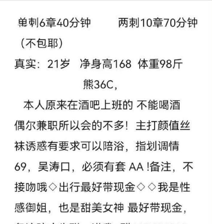 这个女的属于夜场出身,没钱了才会出来兼职,上班时间不固定,所以不好约,不过颜值挺高,和朋友圈照片没啥差距,服务会的不多,颜控的可以去体验一下!!
