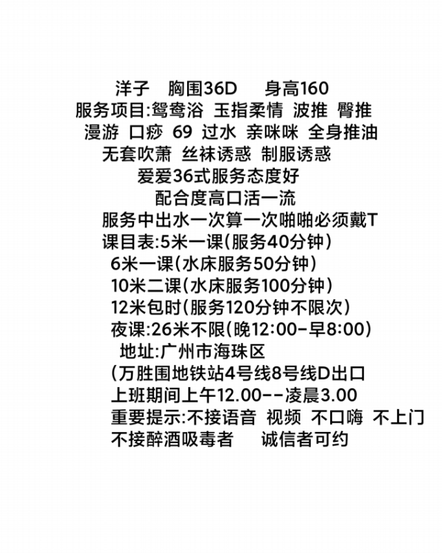 在万胜围附近,遥控上门,老师挺亲切的,个子小小的,第一眼看到妹妹,她穿了一个前短后长的连衣裙,脚踩高跟鞋。看着身材是挺好的。然后给我倒水,小聊了一下。脱衣洗澡,妹妹的身体挺软的,我就喜欢这样的,起码摸着能感觉是一个软绵绵的女人。不像我以前经历过的几个炮友。令人兴奋的水床开始了。我平躺着,妹妹给我全身打了沐浴露,然后用胸和身体给我摩擦。爽的很。令我想到了尊敬的波多野结衣老师的一部片子,哈哈哈,说的有点多。 上床以后在反趴着,妹妹给我后背服务,各种含水刮痧,还有一个我很喜欢,服务名我不知道叫啥,就是一股热水从屁股缝留下来。叫高水流水 还是 应该加细水长流?懂的老司机告诉一下。正面服务完就是啪啪啪了。妹妹先是坐下来。感觉整个JJ都顶进去了。感觉很爽,来回做活塞运动几百次,然后换位置,最后传教士完毕。 完毕后妹妹没有一点催促的意思,趟在怀里聊天,聊了聊人生。最后依依不舍的回家了。 总结:除了工资没涨,基本什么都涨了。500块的价格,能体验这么多项目,我觉得是给我惊喜的。妹妹人很好,很健谈,不催人。服务我觉得应该是上等水平。