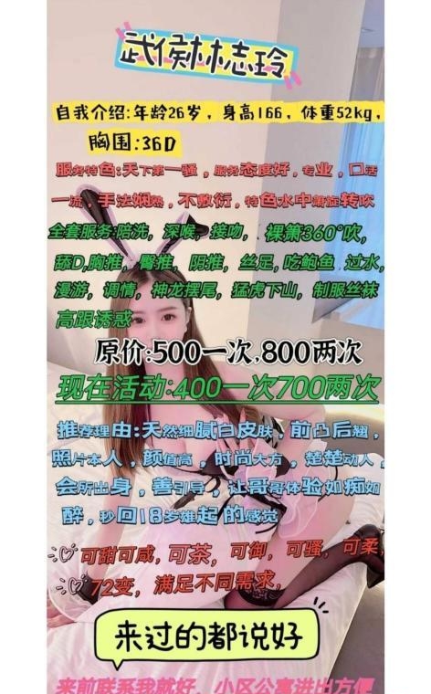 特别认真,耐心。出差成都临时想耍,就加了微信聊了聊。第一刚进去的时候,隔着雨衣都能感觉到里面热乎乎的,还有点紧。第二·简单洗了一下,又开始才艺表演了,吹了大概10来分钟吧,穿上高跟丝袜开始战斗,前面被吸得太舒服了,没多久就熄火了。 总之,妹妹服务巴适,态度也是百分百的Ok,服务也不少。感觉性格很好不催人,而且不时夹一下,配合度也高,她在下面的时候一直在配合着动,爽度提升啊。拜拜啦。下次回来约