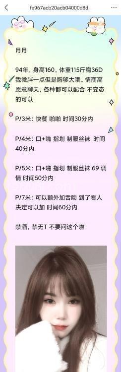 看她胸大屁股大一直都想去找她,可惜离我太远了,今天刚好来这边,想起她直接过来了, MIM年纪30左右,具体不确定,不过还算可以,颜值一般,主要是和其它做服务的MM比的,身材可以,大胸,大屁股,也不肥,硬件80分.比主流桑拿服务80%的MM要好,态度也不错,应该刚刚从桑拿转战QM,做的是 300,加一百可以体验无套,服务可以,细节不多说了,也是那些,啪啪有水,会夹,很配合,女上波上下遥,会主动捉我手去摸她胸,特别后入屁股有肉,啪啪声很大,会根据我的力度配合着叫床,最后正常位下面在插,看着胸在上下摇,MM闭着眼睛轻咬着唇,发发轻轻呻吟声,很有感觉。性价比很高,值得试试