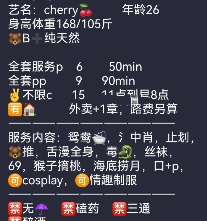 服务项目: 鸳鸯浴 水中萧 指划 胸推 漫游 69 口爆 做爱