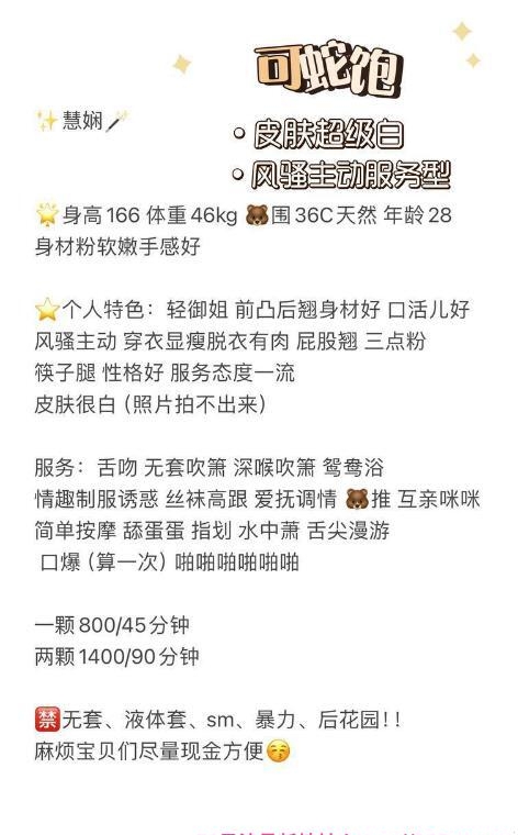 小姐姐颜值不错,还会一字马呢,胸大屁股大,奶子粉嫩粉嫩的手感摸起来很软,专业全套莞式服务,可以帮洗澡,洗屁股,爱爱的时候夹的很舒服,很爽,喜欢大奶子的可以试试,很会服侍人香舌在我的身上舔着,一路舔下去,小弟弟被她侍候的充满了活力。每一寸皮肤都被她滋润了,把我全身亲的都是印记,口活非常棒特别是独龙,毒龙的时候把我麻的不行,跟小电钻似的够厉害也够玩的开得,水特别多,姿势配合的非常好。
