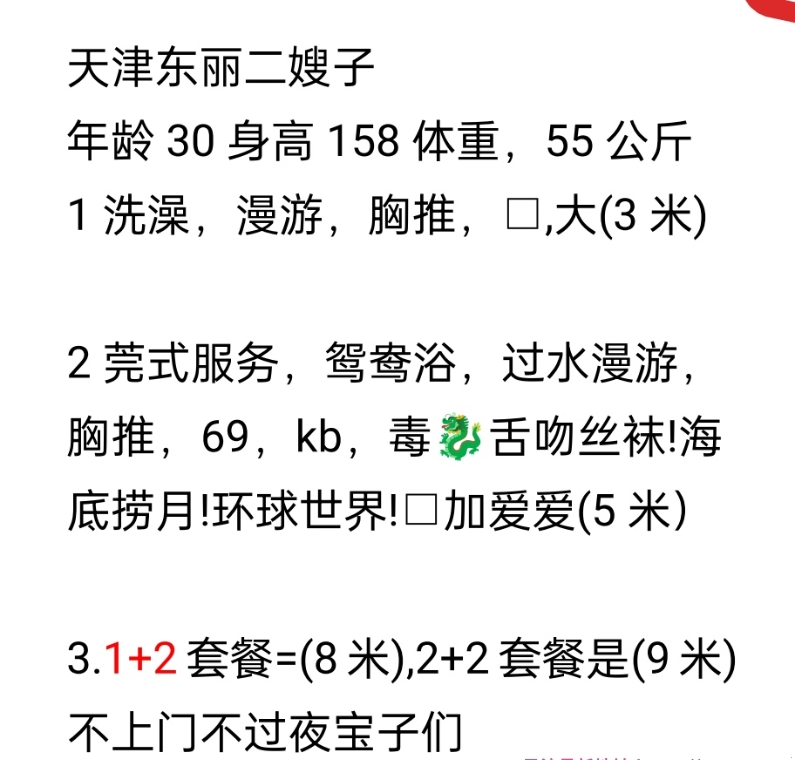 天津二嫂子很出名,再发一下她的新的联系方式,想泄火选三张的,推荐五张,毒龙确实没话说,舌头直接怼进去很舒服,陪你洗澡陪你调情服务确实没得挑现在基本上在东丽待着,有兴趣可以去试试