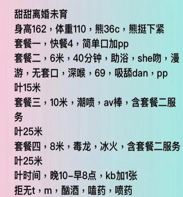 离婚没孩子,身材好 皮肤白,服务好体贴入微,400到1000价格不同 ,离异寂寞少妇需要附近狼友的安慰和关心。