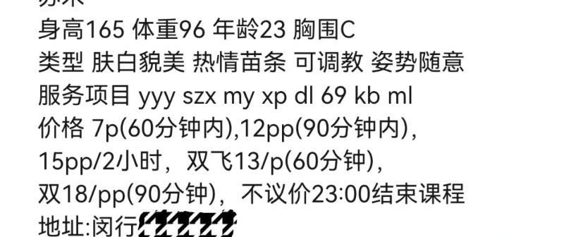 御姐苏禾,是湖北恩施土家族,颜值高,身材瘦长,熊大概B杯,真人照片打九折。不会写小黄文,服务是全套,刻表上项目都有做,毒龙,ab面啥的,态度好诚恳。比起嫩妹快餐那性价比陡增,小狼有时间会再刷的。