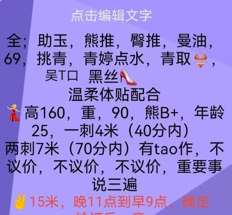 加了好久 没空去 中午趁着下班去体验了下班 看照片都太有欲望了 特别安全小心 帮你洗了 上床把你擦干净 趴着先舔 然后撅着屁股 一边毒龙 一边玩你弟弟 感觉一下就上来了 玩一会我嫌太痒了 翻过来 继续帮你舔 一遍舔 一边浪尖 实在受不了 带上 就冲刺 趴在你身上 舔着耳朵 叫 那感觉实在刺激 没一会交枪 也不催你走 还不错的!