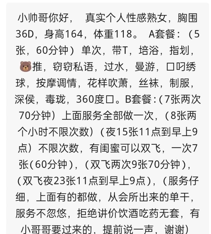 朋友前两天说刚去挺爽的,就推给我了,正好这两天也闲着,没事干,顺便过去看看,在明发那边,住的是个小区,她还有个小姐妹,可以双飞,然后看到她那个胸确实大,她说是36d的,是真胸,服务很牛逼,也是很到位的,跟会所服务差不多,不愧从会所出来的,全部都给整一遍,都爽翻天了,干了两次,第一次服务给我给整出来的,没忍住,服务太爽了