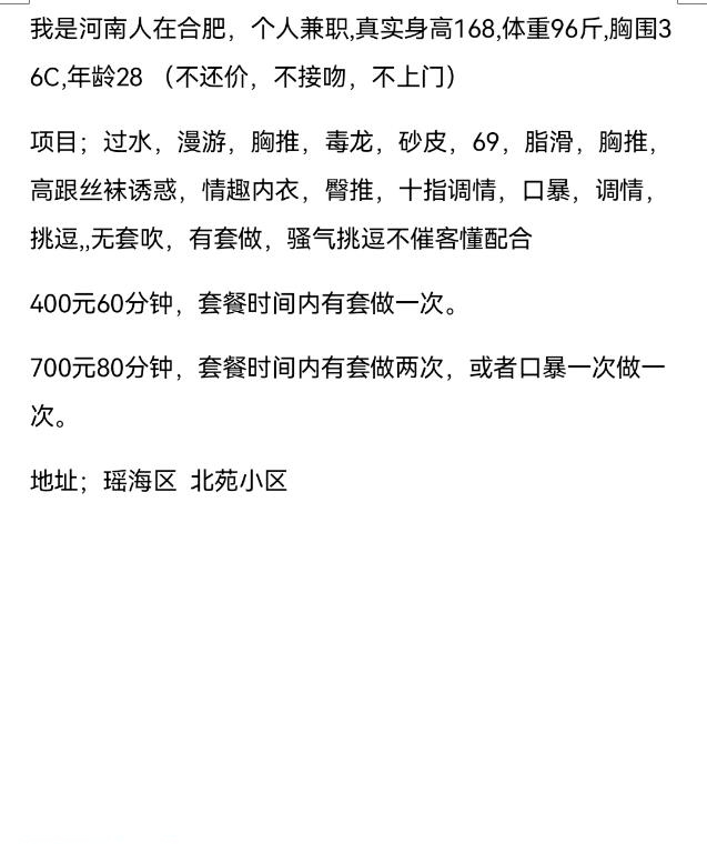 今天又去合肥找这个可以抠逼的妹妹,态度非常好,情绪价值拉满,特别对胃口。开门她就穿着透沙的情趣睡衣,隐约可以看见丁字裤,看着就硬了,一起洗澡,用手揉着又圆又白的大奶子,软乎乎又有弹性,捏着肉感十足,很舒服。上床她给我口,舌头温热又灵活,舔得很细致,深喉含得深,没一点牙齿感,口活还是那么好。69式舔着妹妹的阴蒂,手指轻轻插进去,挺紧的,玩了一会,妹妹高潮了,然后戴套先是女上位。妹妹大屁股坐上来来回抽插晃动,不一会就缴枪了!!二次换了几个姿势,从床上干到客厅沙发,配合度很高!整个人爽到发软。服务态度温柔。屁股又大又软有弹性 喜欢翘臀的直的可以试,很过瘾。