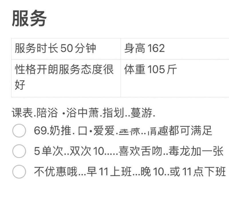 服务项目: 69 奶推 口 丝袜 舌吻 情趣制服 鸳鸯浴