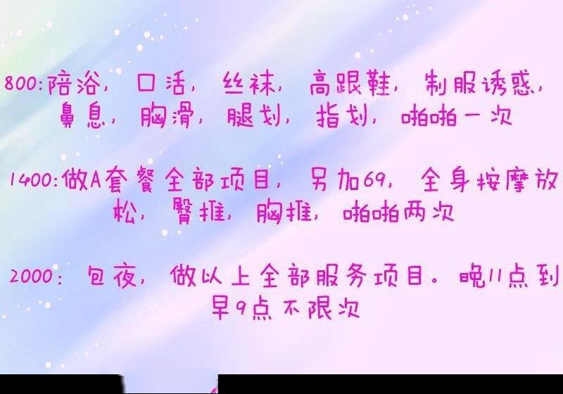 小姐姐颜值不错,还会一字马呢,胸大屁股大,奶子粉嫩粉嫩的手感摸起来很软,专业全套莞式服务,可以帮洗澡,洗屁股,爱爱的时候夹的很舒服,很爽,喜欢大奶子的可以试试,很会服侍人香舌在我的身上舔着,一路舔下去,小弟弟被她侍候的充满了活力。每一寸皮肤都被她滋润了,把我全身亲的都是印记,口活非常棒特别是独龙,毒龙的时候把我麻的不行,跟小电钻似的够厉害也够玩的开得,水特别多,姿势配合的非常好。