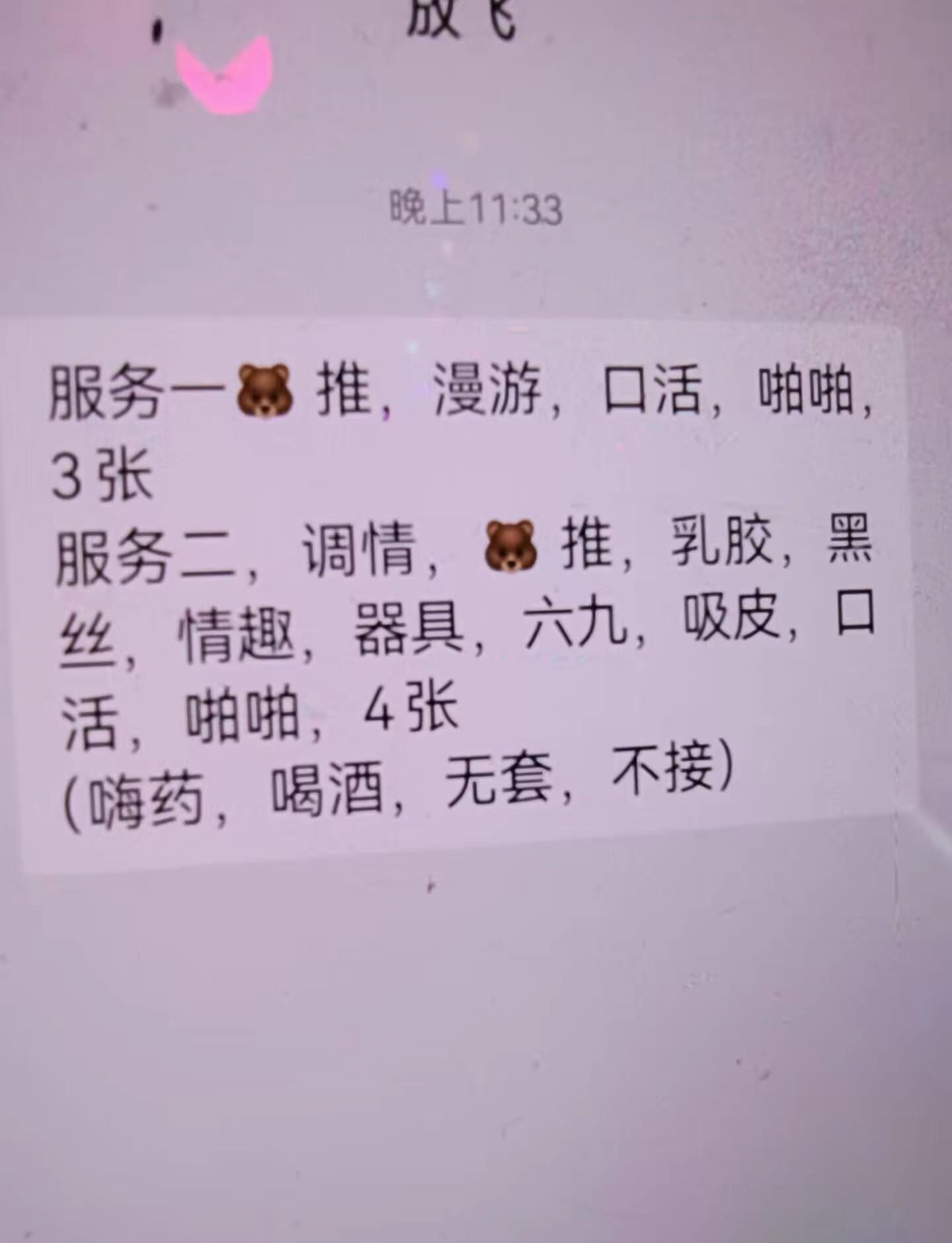 服务项目: 情趣内衣 陪浴 无T口 冰火 毒龙 波推 69 漫游等